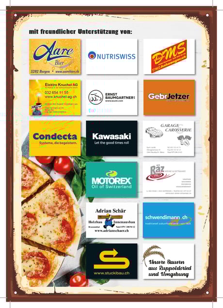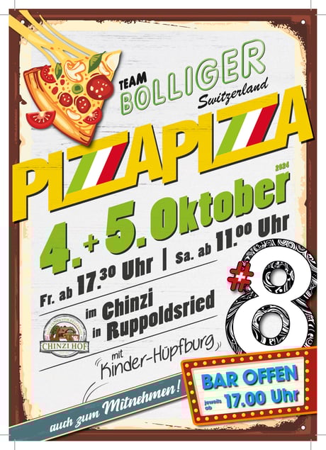 Seit 1997 veranstalten wir das Pizzafest in Ruppoldsried. Bis ins Jahr 2022 fand das Pizzafest im Restaurant Löwen bei Heidi Mäder statt. Seit 2023 hat das Fest einen neuen Standort in Ruppoldsried.